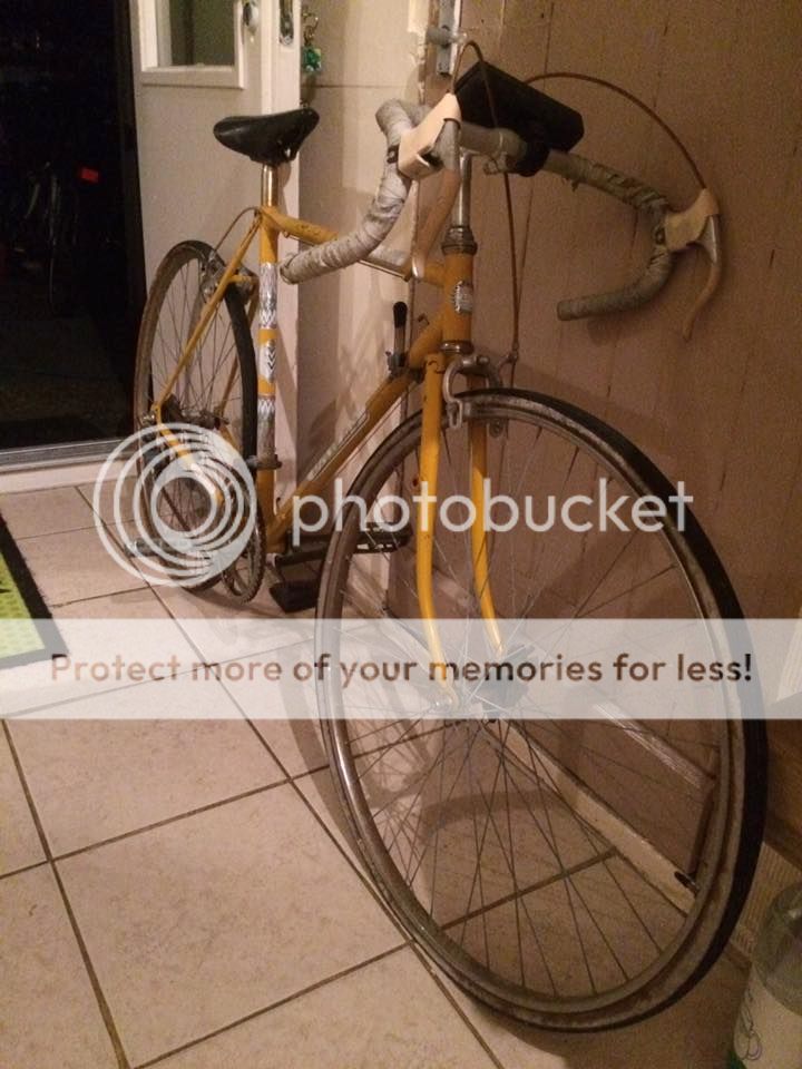 Now with a slight check on some of the rust with some steel wool with more that needs a rub down a different saddle with some give as the original plastic one had a very hard ride, borrowed tires from another 70's bike and the disintegrating bar wrap removed it's ride-able!