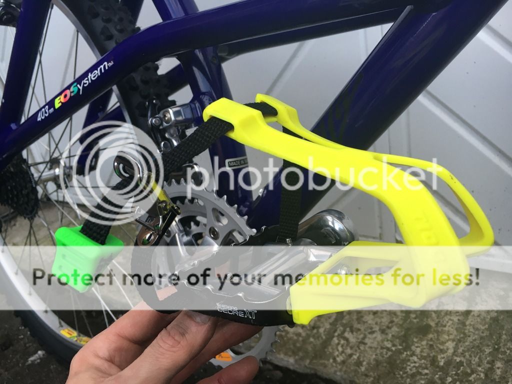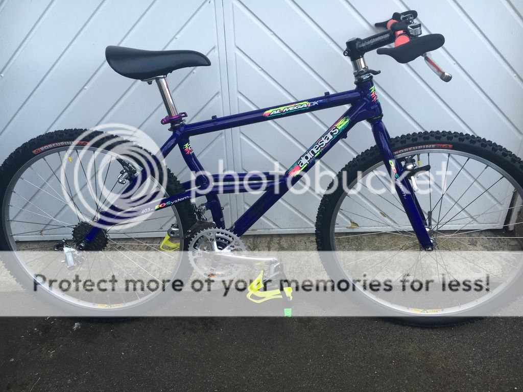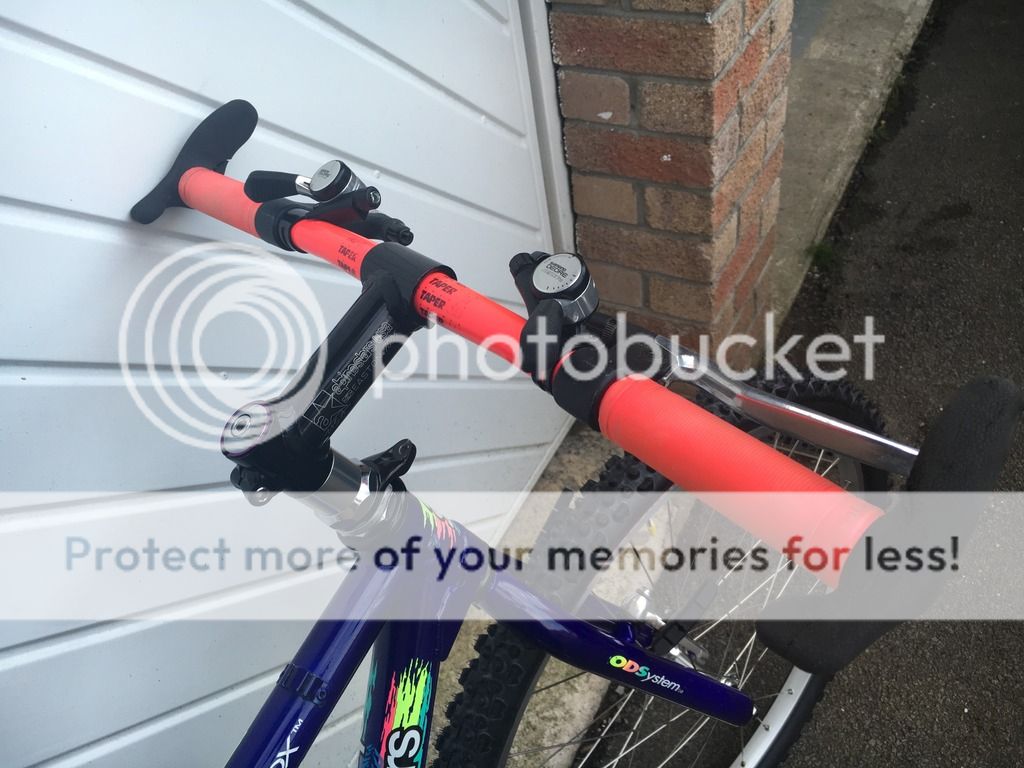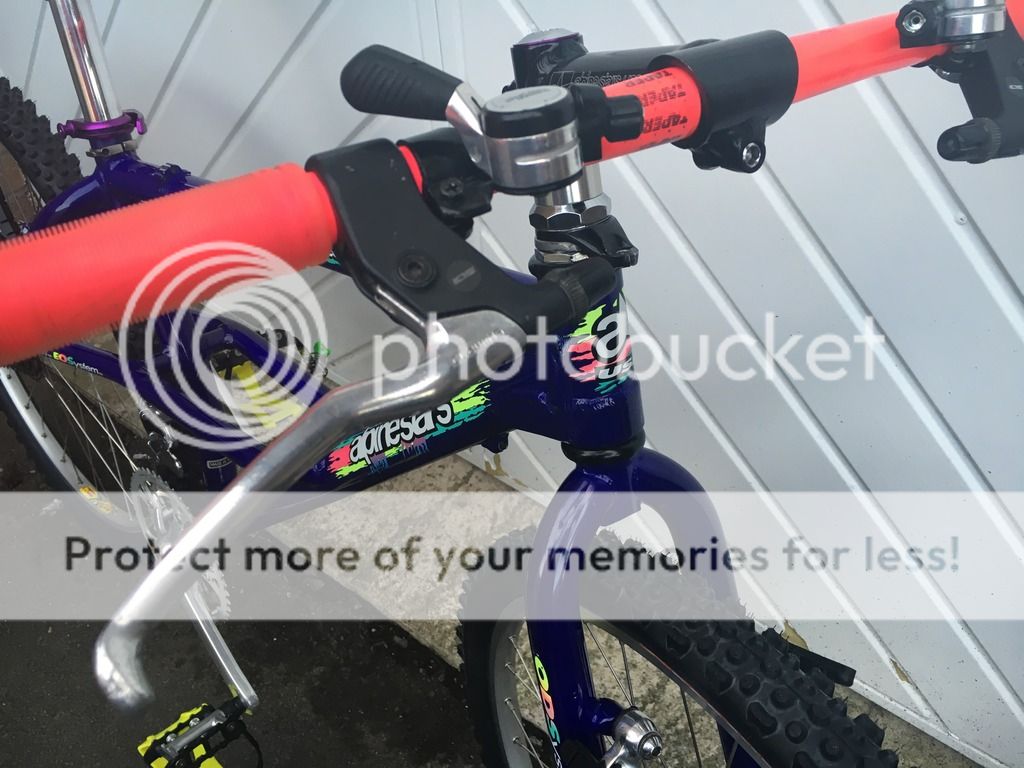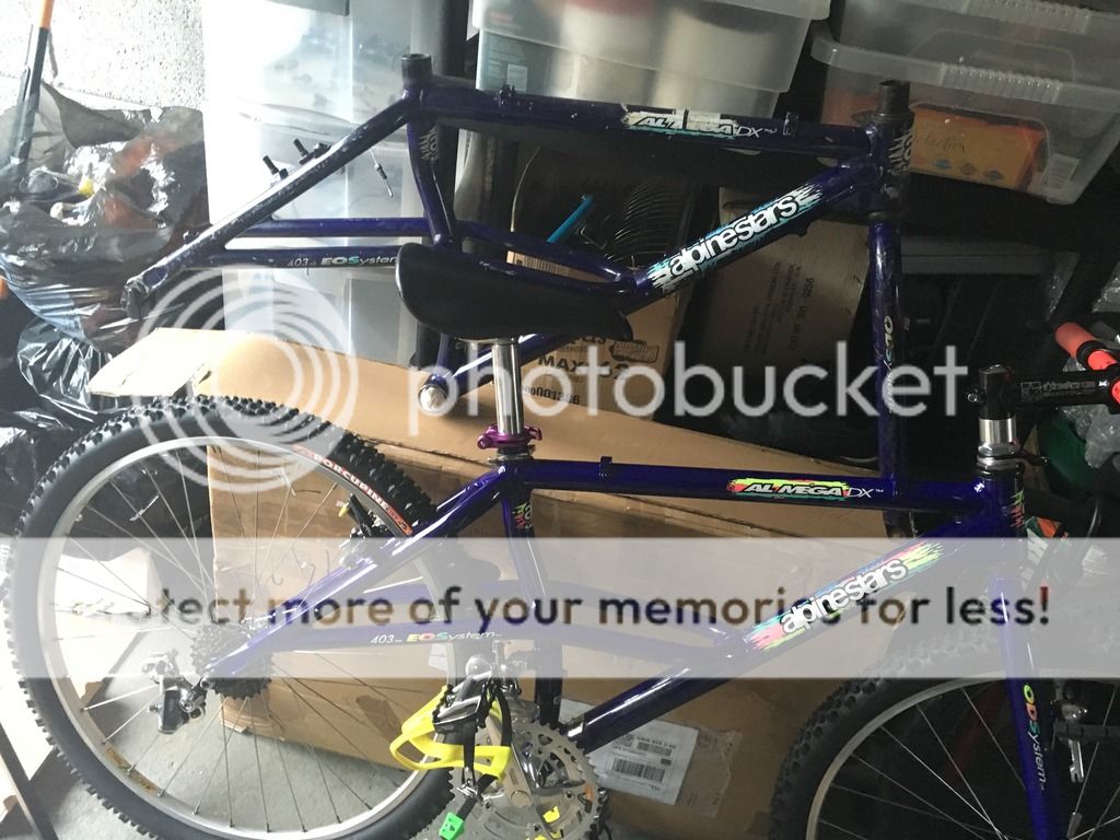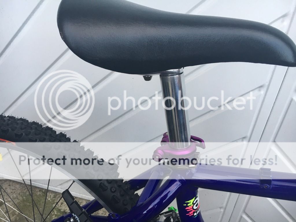 Had to lop two inches off the seatpost to get it in at a low position because of the curved seattube. The green Tioga Hot Tip toestrap ends will be swapped to neon pink and the black straps kept as they are. It was originally gonna have pink straps and the green tips to match the green in the frame decals. Only it turns out the decals are not really that green so they're going to be swapped for the pink (thanks to Ian aka 'racer-x').