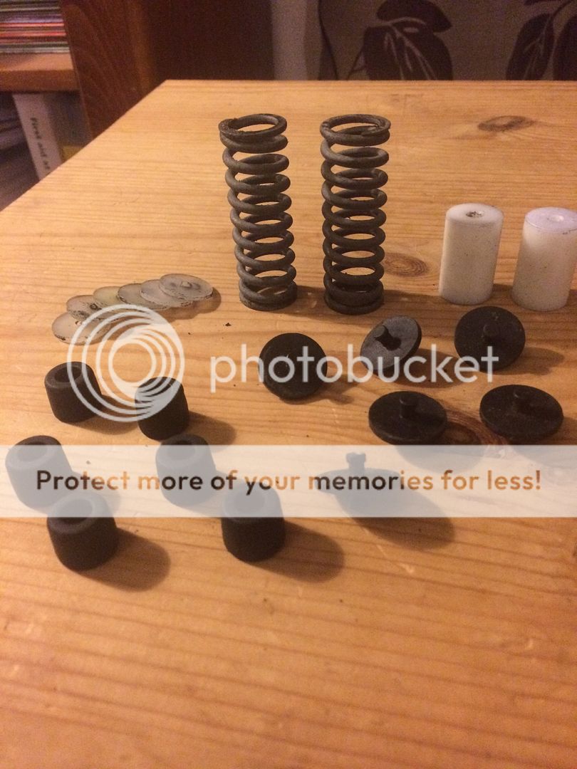 So the quadras. yes they were junk. the elastomers have snapped a 1/3 of the way down. My though was to cut the good bit off. and try and pack the rest. i dont care about the bounce really. I'm not forking out £40 quid for a kronos spring kit. Needs to be a cheap solution. if i get serious with the bike i will swap in some bombers.