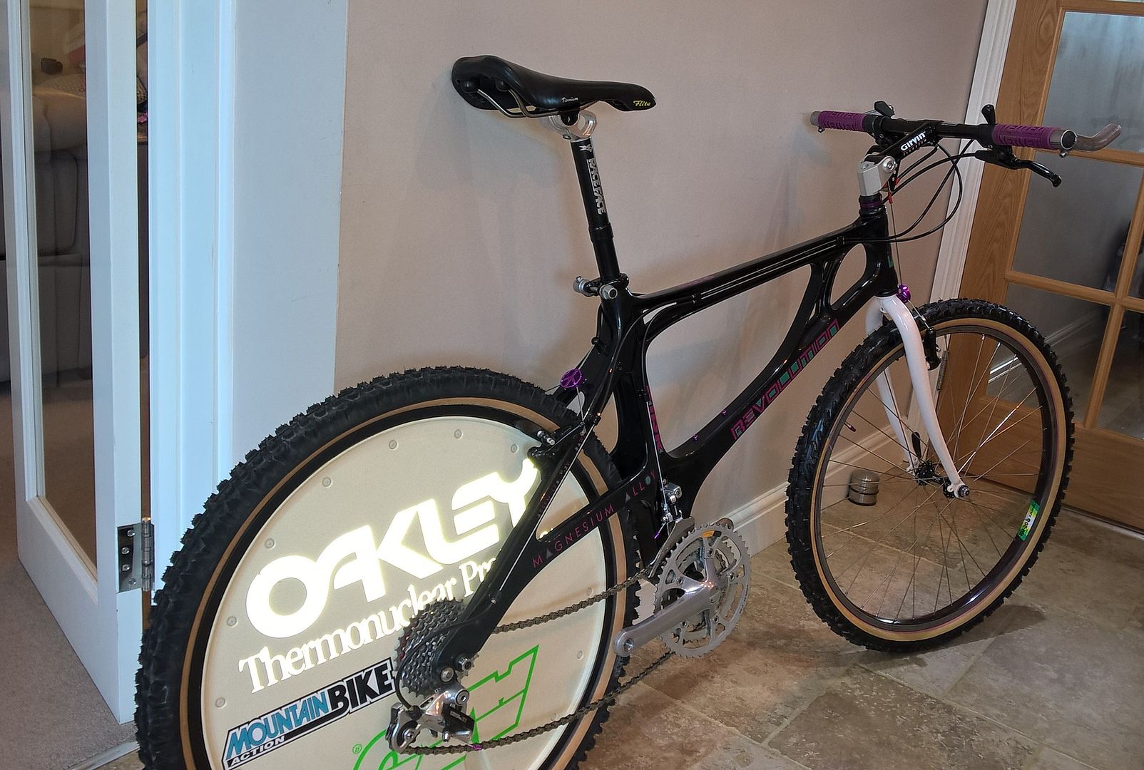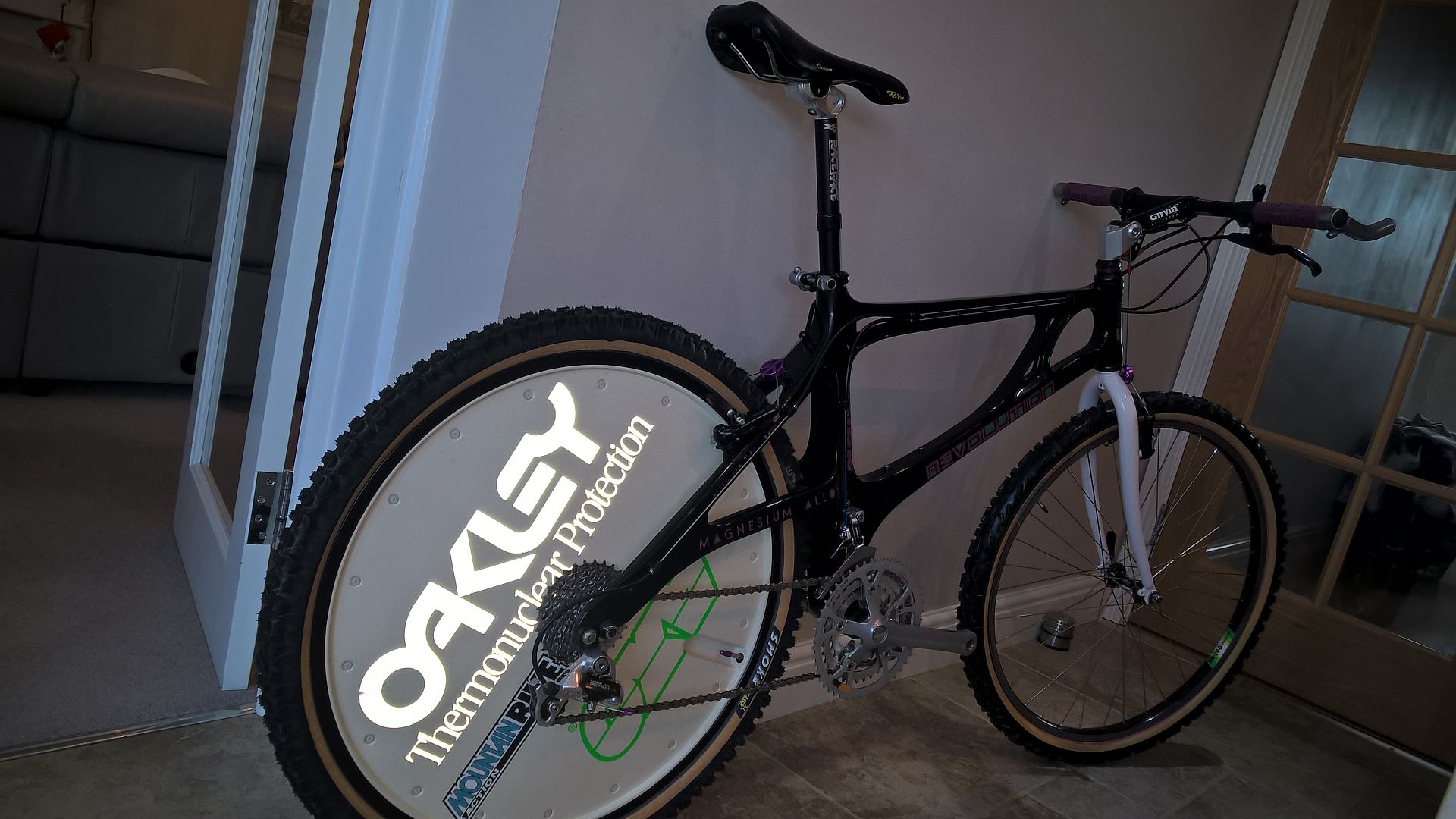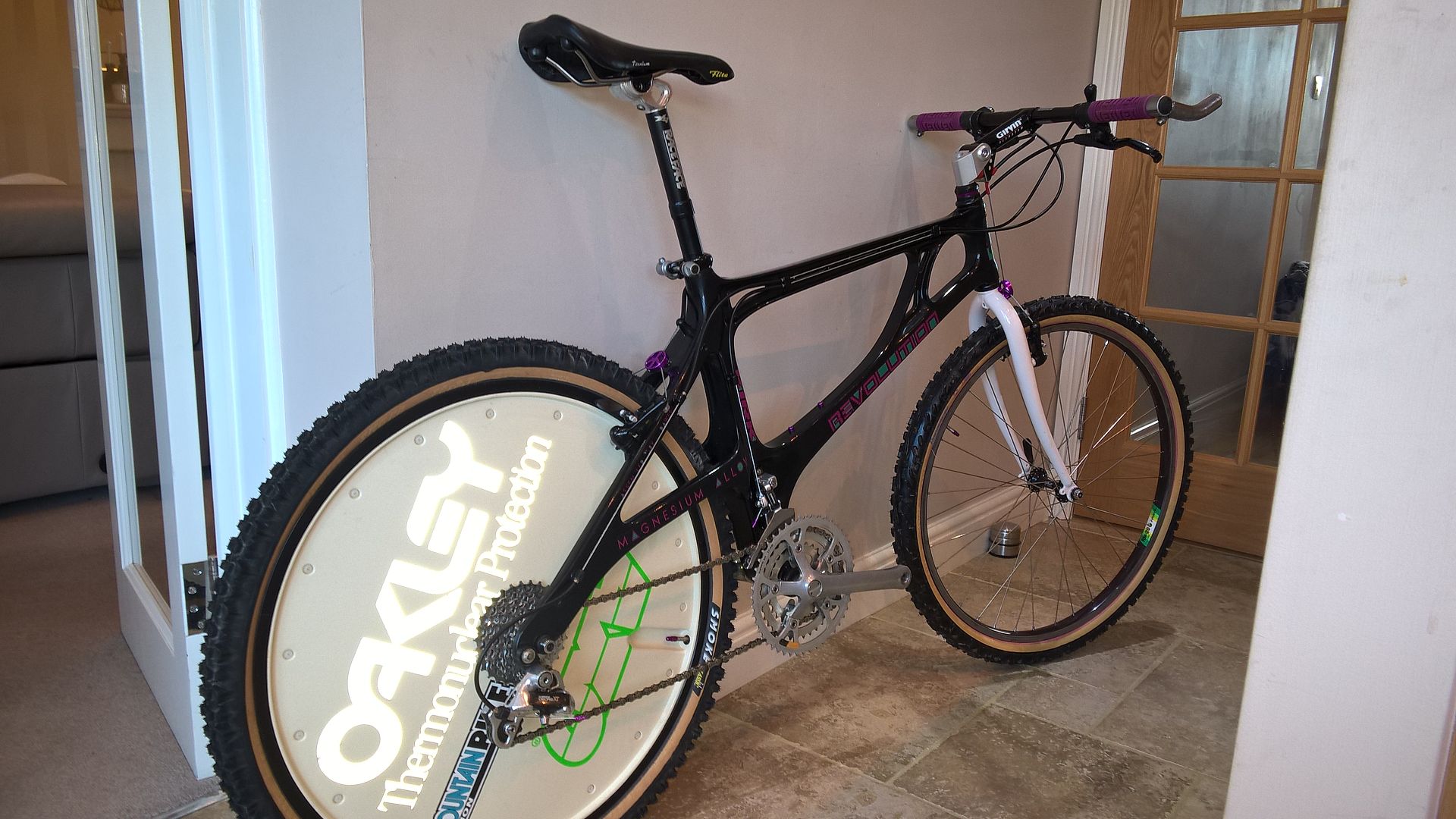 Next one out was the XT M732 rear wheel and the pseudo Disc (cover) I bought as it seemed like a good idea at the time but couldn’t find a permanent home for it as it just doesn’t work on other builds but with the white forks up front it’s balanced, and the highly reflective logo are cool as hell.