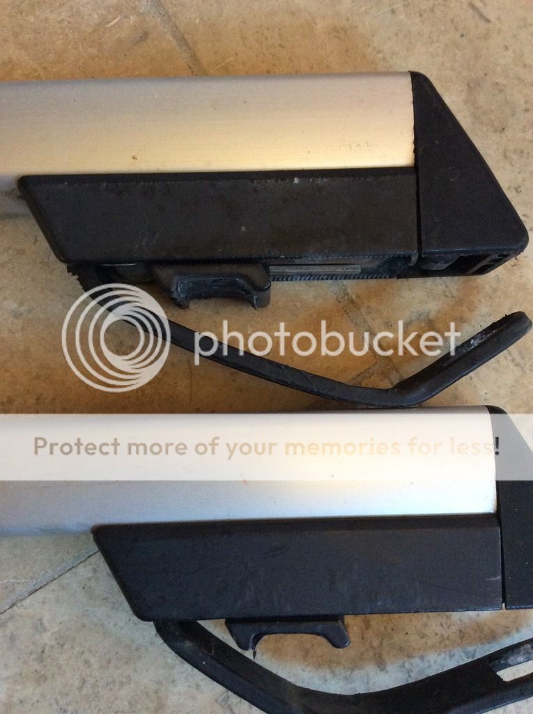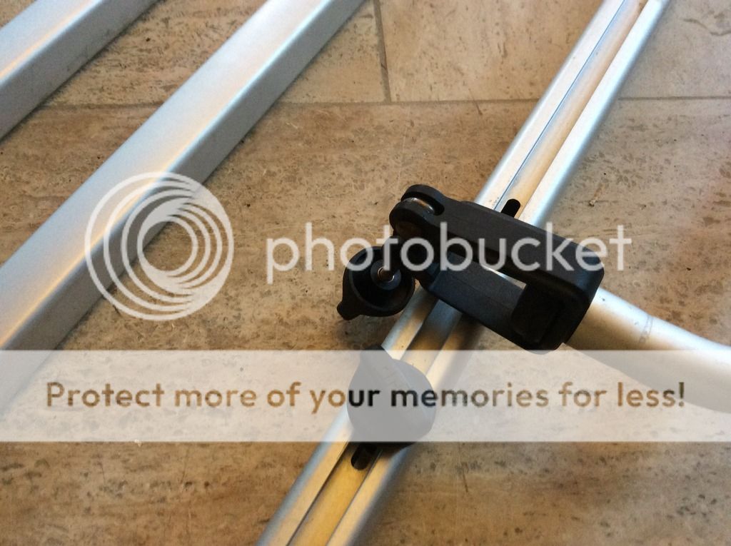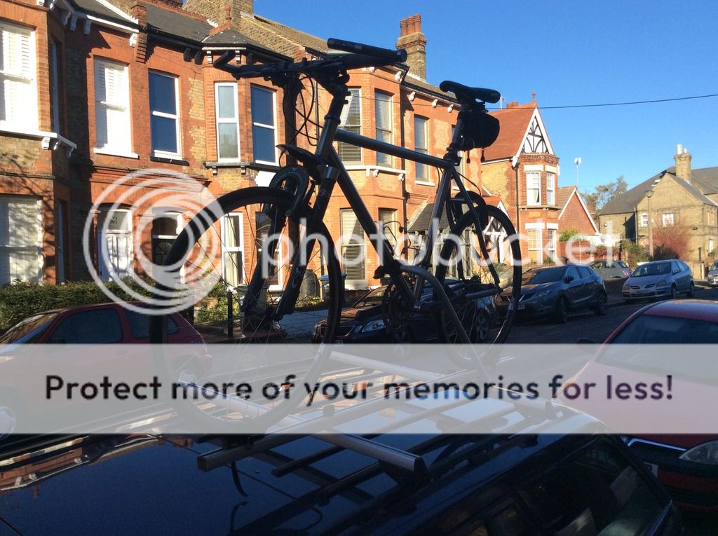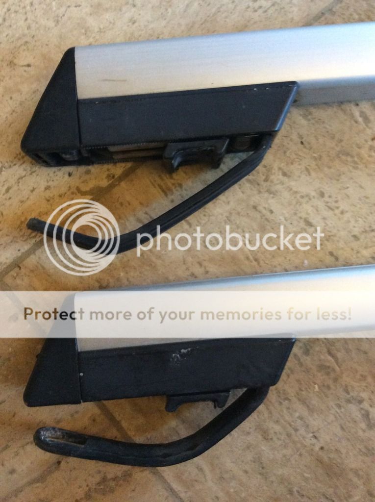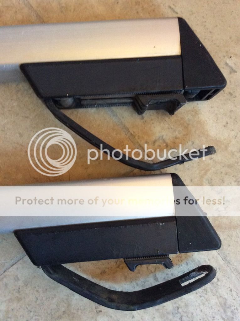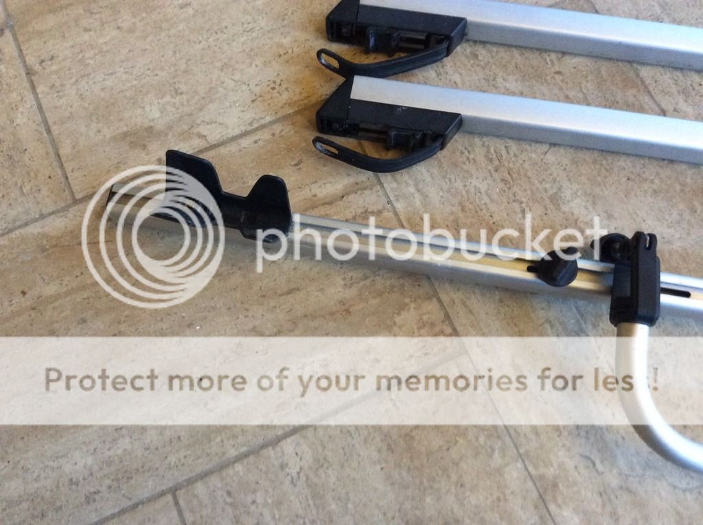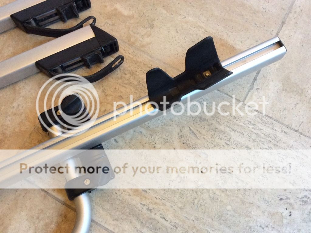 Overall the roof bars are in good condition but of course they will show signs of use and age. Have used the roof bars and they've cleaned up nicely (and now removed from the car) with no signs of corrosion of the alloy but there is some bubbling of the paint on the roof rail mounts. There is also a bit of paint loss where the roof rail straps have been fitted and removed but this is all hidden by the black end caps. All of the lock cover end caps are on place. The bike carriers have been stored in the basement so they are a bit dusty and could do with a clean but again they are in good condition.