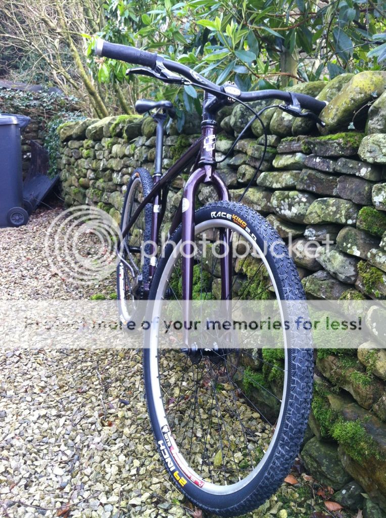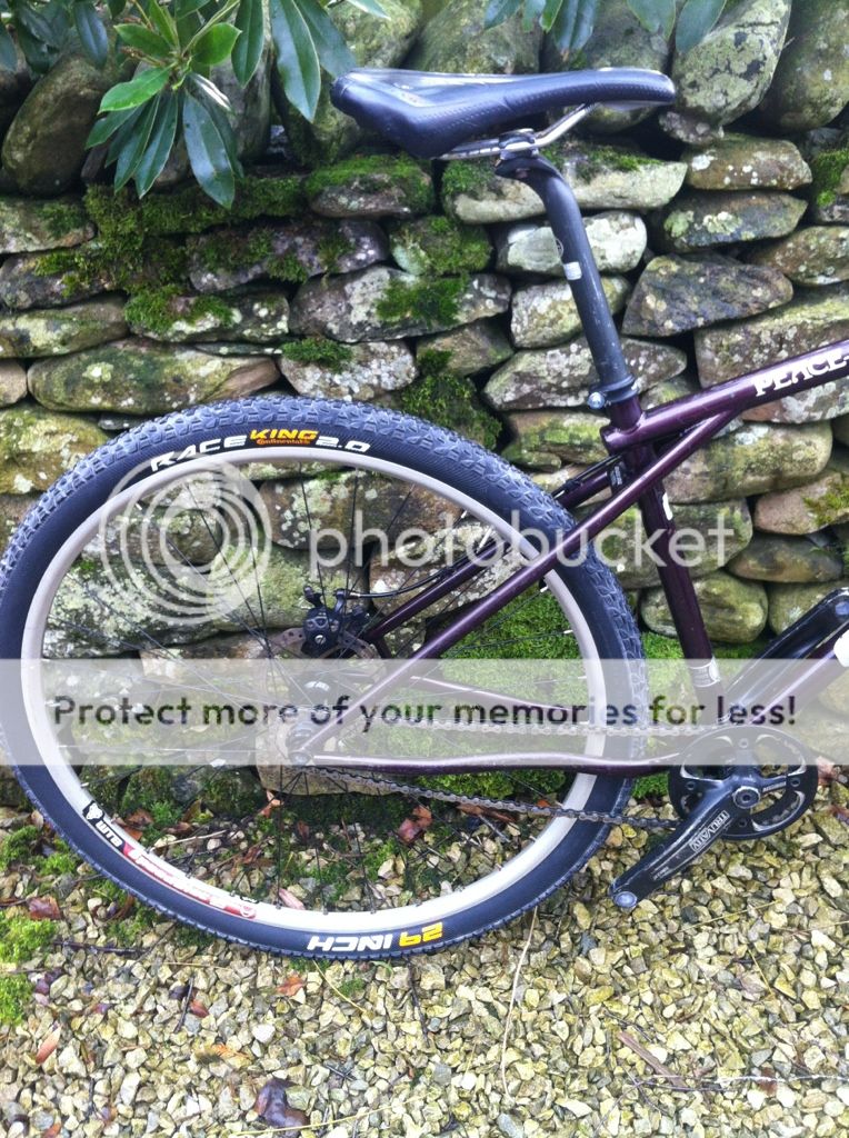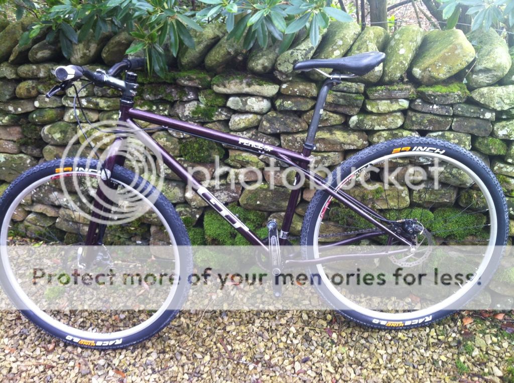Steel frame, pretty much stock spec - medium size (5'8" - 6" ish) WTB Speedisc rims, Tektro disk brakes, GT hubs and seatpin, Specialized BG saddle, Easton Bars n Stem, Ergon grips, alloy pedale, Truvative Blaze singlespeed crankset, external BB and Eccentric BB. Brand New Race King 2.0" tyres.