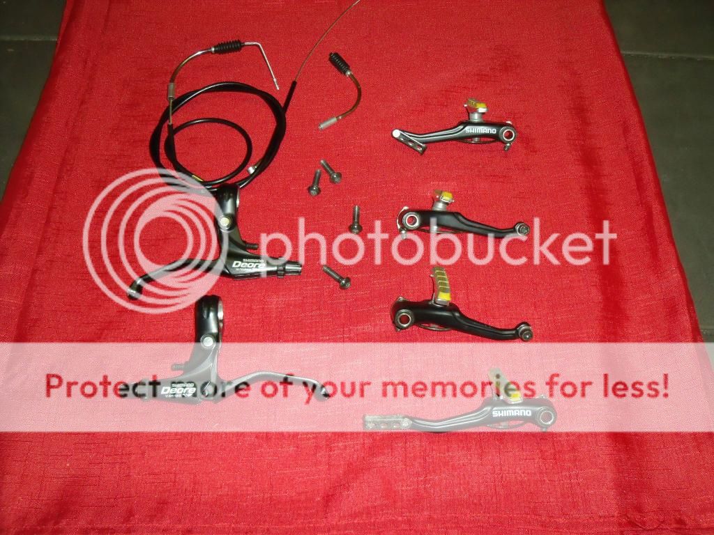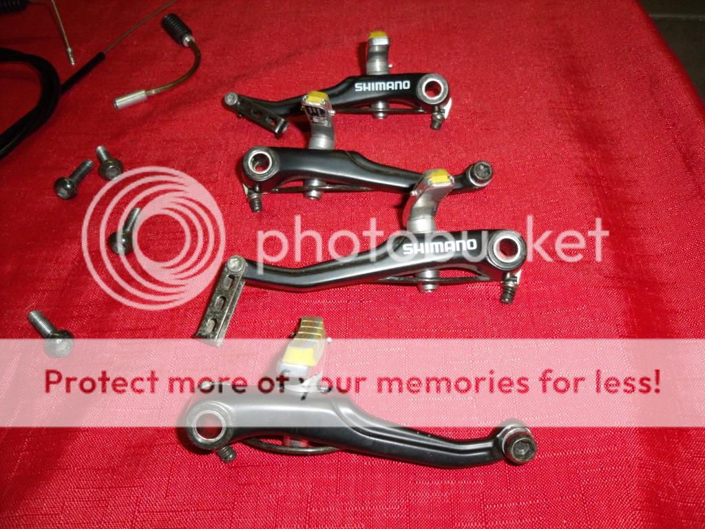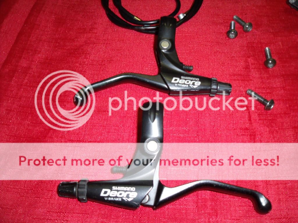 Shimano M420 V brake calipers with Deore brake levers. Recent cables - long enough for a 20" MTB with 100mm forks. Reasonable pad life left on cartridge pads.